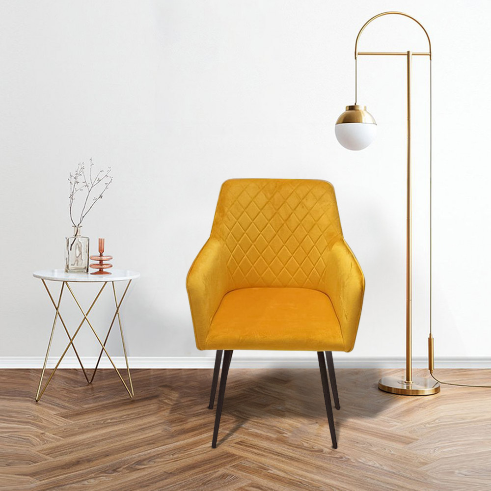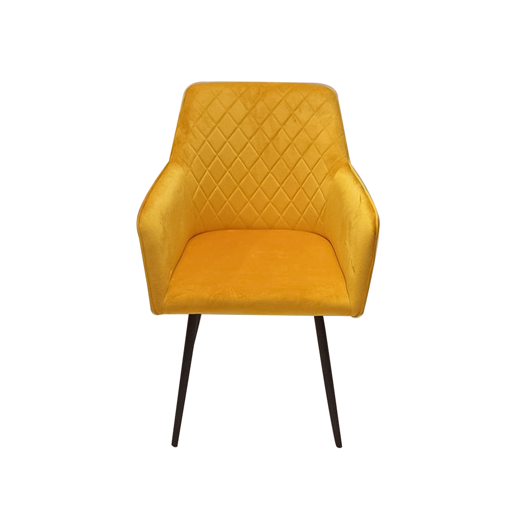 يتميز هذا الكرسي بتصميم عصري وبسيط يندمج بسلاسة مع مختلف الديكورات. يأتي بمقعد مبطن بقماش المخمل الفاخر باللون الأصفر الجذاب، مما يوفر راحة استثنائية ودعماً مثالياً للظهر أثناء الجلوس لفترات طويلة. الأرجل الأربعة المصنوعة من المعدن تضمن ثباتًا واستقرارًا لا مثيل لهما، مما يجعله إضافة آمنة وعملية لمنزلك.