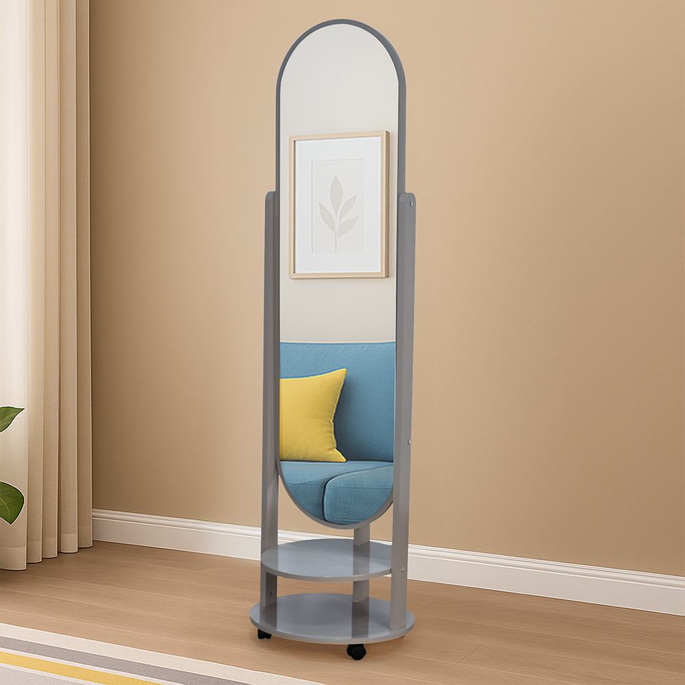 تعد مرآة بطول كامل توفر رؤية واضحة ومتكاملة، مثبتة على هيكل قوي ومتين. الجزء السفلي مزود برفين دائريين من نفس الخامة، مما يسهل تخزين الإكسسوارات، العطور، والمستحضرات التجميلية. تم تجهيز المرآة بعجلات لسهولة النقل بين الغرف.